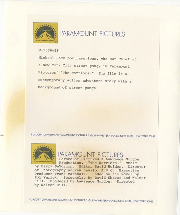 The Warriors Michael Beck on New York Subway Original 8x10 Photo with Snipe 1979 Near Mint Condition This item is an ORIGINAL 8x10 photo from the historic archives of Silver Screen Mementos. This original photograph was made in the actual year the film, television show or event was produced. The movie studios produced publicity photographs for distribution to the press, photo agencies and publicity departments to advertise the film/tv show or event. Very often original photos have press release information on the reverse of the photo - movie credits, description of the scene, event and people involved. This is a historic piece of cinema art and is being offered from one collector to another, no rights given or implied. Silver Screen are gradually releasing thousands of Original Photographs, Transparencies, Negatives, Lobby Cards, Posters, Magazines and other memorabilia from our historic archive.