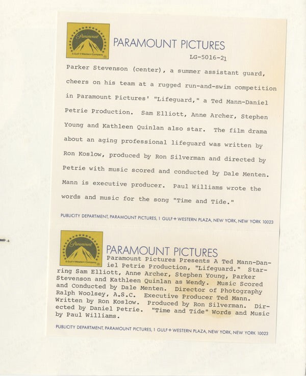 Lifeguard Barechested Parker Stevenson beach relay race Original 8x10 Photo with Snipe 1975 Near Mint Condition This item is an ORIGINAL 8x10 photo from the historic archives of Silver Screen Mementos. This original photograph was made in the actual year the film, television show or event was produced. The movie studios produced publicity photographs for distribution to the press, photo agencies and publicity departments to advertise the film/tv show or event. Very often original photos have press release information on the reverse of the photo - movie credits, description of the scene, event and people involved. This is a historic piece of cinema art and is being offered from one collector to another, no rights given or implied. Silver Screen are gradually releasing thousands of Original Photographs, Transparencies, Negatives, Lobby Cards, Posters, Magazines and other memorabilia from our historic archive.