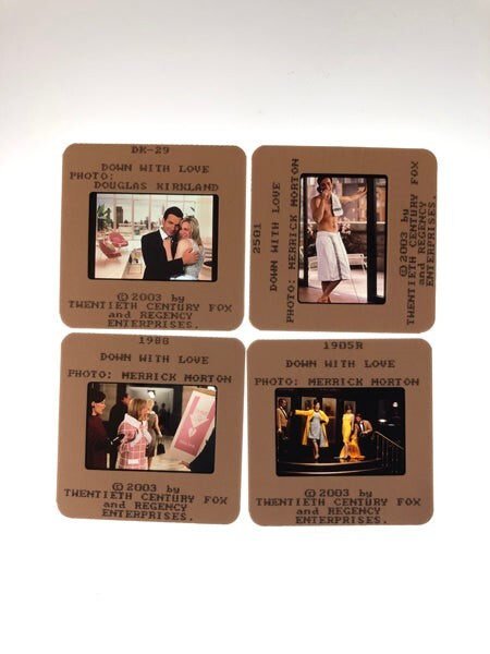 Down With Love 2003 Collection x 14 Original 35mm Transparency Slides from movie starring Ewan McGregor, Renee Zellweger, David Hyde Pierce, Sarah Paulson, Jeri Ryan.This is an original studio or photographer's 35 mm color slide transparency from our historic archive. This is a real collector's item and would make superb quality photographs or prints. This would also be a great addition to any collection or image archive. This original color slide transparency is in Excellent condition. This collector's item is being sold from one collector to another, no rights are given or implied. Silver Screen Mementos are gradually releasing from their vast archives thousands of original photographs, transparencies, negatives, slides, lobby cards and other movie or television memorabilia.