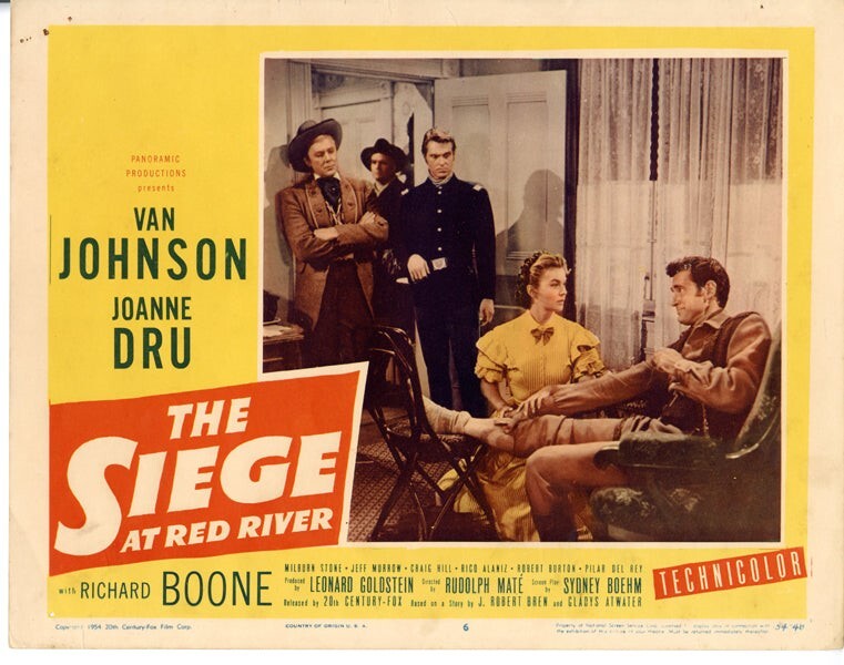 The Siege At Red River Original 11x14 Lobby Card 1954 Van Johnson Joanne Dru Richard Boone Milburn Stone Excellent Condition Silver Screen Mementos are pleased to be able to offer this authentic original Lobby Card measuring 11x14 inches. This lobby card is from USA and was printed during the actual year the film was released in movie theaters. The lobby card (also known as Front of House/ FOH card in the UK) was created by the film studios to publicize the movie and was intended for display inside the movie theatre. These are NOT reproductions! You are looking at a truly original piece of cinema art, a genuine collector's item. We have a huge archive of over 250,000 original lobby cards, mostly from the 1930's to the 1980's. We will be releasing many more rare gems from our vast collection, which will include Lobby Cards, original photographs, movie stills, Original Movie Posters, transparencies, negatives, slides, magazines, brochures, press books and other movie memorabilia.