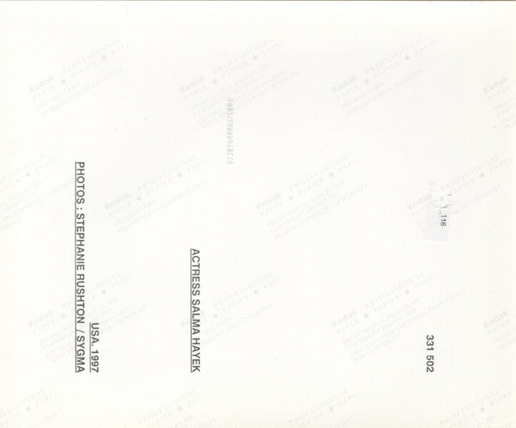 Salma Hayek Gorgeous Vivid Color 1997 Stamped Original 8x10 Glamour Photograph Near Mint Condition This item is an ORIGINAL 8x10 photo from the historic archives of Silver Screen Mementos. This original photograph was made in the actual year the film, television show or event was produced. The movie studios produced publicity photographs for distribution to the press, photo agencies and publicity departments to advertise the film/tv show or event. Very often original photos have press release information on the reverse of the photo - movie credits, description of the scene, event and people involved. This is a historic piece of cinema art and is being offered from one collector to another, no rights given or implied. Silver Screen are gradually releasing thousands of Original Photographs, Transparencies, Negatives, Lobby Cards, Posters, Magazines and other memorabilia from our historic archive.