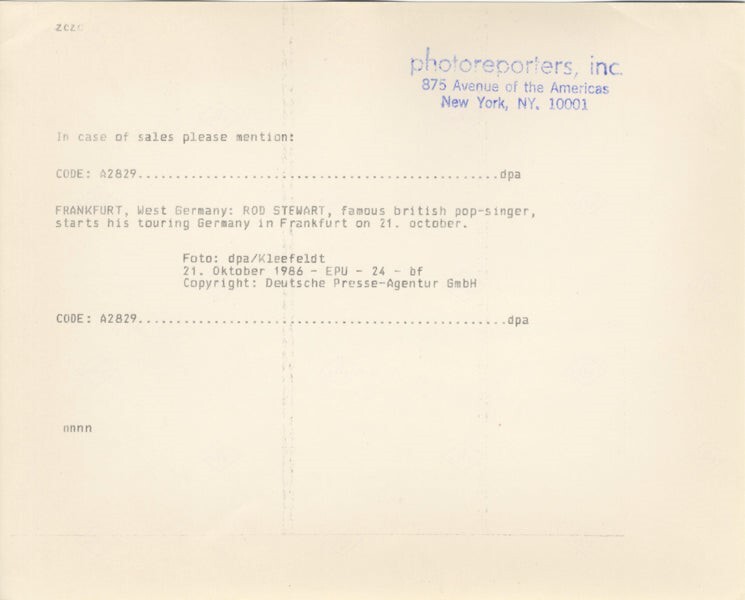 Rod Stewart Singing in Concert 1986 Tour Frankfurt Germany Original 8x10 Photo Stamped with Snipe Near Mint Condition This item is an ORIGINAL 8x10 photo from the historic archives of Silver Screen Mementos. This original photograph was made in the actual year the film, television show or event was produced. The movie studios produced publicity photographs for distribution to the press, photo agencies and publicity departments to advertise the film/tv show or event. Very often original photos have press release information on the reverse of the photo - movie credits, description of the scene, event and people involved. This is a historic piece of cinema art and is being offered from one collector to another, no rights given or implied. Silver Screen are gradually releasing thousands of Original Photographs, Transparencies, Negatives, Lobby Cards, Posters, Magazines and other memorabilia from our historic archive.