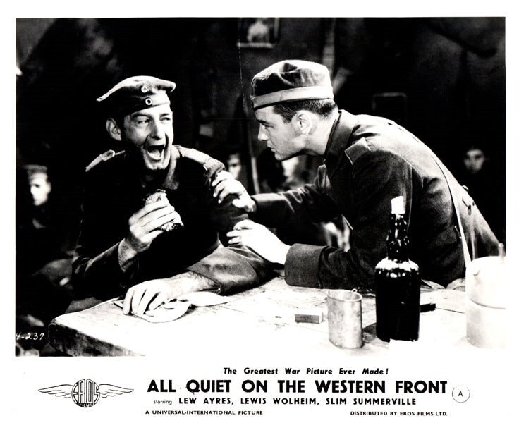 All Quiet On The Western Front Original Lobby Card 1930 Lew Ayres Louis Wolheim 1950's re-release of the classic World War 1 film - VG Condition Silver Screen Mementos are pleased to be able to offer this authentic original Lobby Card measuring 8x10 inches. This lobby card is from Great Britain and was printed during the actual year the film was released in movie theaters. The lobby card (also known as Front of House/ FOH card in the UK) was created by the film studios to publicize the movie and was intended for display outside the movie theatre in special glass display boxes. These are NOT reproductions! You are looking at a truly original piece of cinema art, a genuine collector's item. We have a huge archive of over 250,000 original lobby cards, mostly from the 1930's to the 1980's. We will be releasing many more rare gems from our vast collection, which will include lobby cards, original photographs, movie stills, magazines, brochures negatives, transparencies, slides and other collectible items of movie memorabilia.