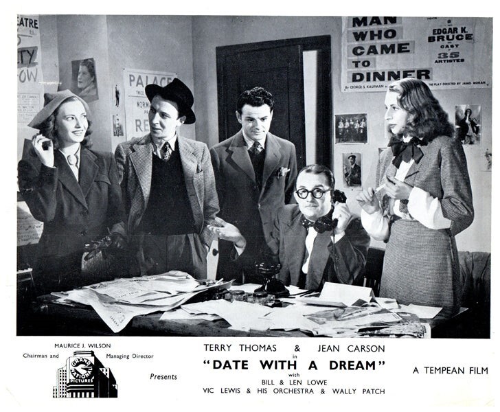 Date With A Dream Original Lobby Card 1948 Terry-Thomas Jeannie Carson Len Lowe Bill Lowe VG Condition Silver Screen Mementos are pleased to be able to offer this authentic original Lobby Card measuring 8x10 inches. This lobby card is from Great Britain and was printed during the actual year the film was released in movie theaters. The lobby card (also known as Front of House/ FOH card in the UK) was created by the film studios to publicize the movie and was intended for display outside the movie theatre in special glass display boxes. These are NOT reproductions! You are looking at a truly original piece of cinema art, a genuine collector's item. We have a huge archive of over 250,000 original lobby cards, mostly from the 1930's to the 1980's. We will be releasing many more rare gems from our vast collection, which will include lobby cards, original photographs, movie stills, magazines, brochures negatives, transparencies, slides and other collectible items of movie memorabilia.
