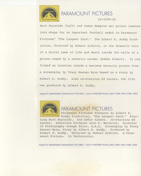 The Longest Yard Mean Machine Burt Reynolds James Hampton Original 8x10 Photo VG/Near Mint Condition This item is an ORIGINAL 8x10 photo from the historic archives of Silver Screen Mementos. This original photograph was made in the actual year the film, television show or event was produced. The movie studios produced publicity photographs for distribution to the press, photo agencies and publicity departments to advertise the film/tv show or event. Very often original photos have press release information on the reverse of the photo - movie credits, description of the scene, event and people involved. This is a historic piece of cinema art and is being offered from one collector to another, no rights given or implied. Silver Screen are gradually releasing thousands of Original Photographs, Transparencies, Negatives, Lobby Cards, Posters, Magazines and other memorabilia from our historic archive.
