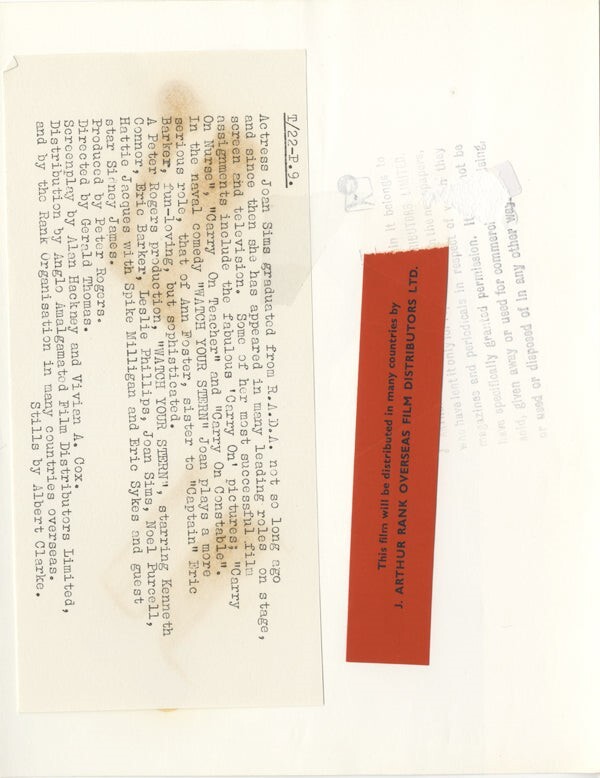 Joan Sims Original 8x10 Photo Carry on star 1960 Watch Your Stern w paper snipe VG Condition This item is an ORIGINAL 8x10 photo from the historic archives of Silver Screen Mementos. This original photograph was made in the actual year the film, television show or event was produced. The movie studios produced publicity photographs for distribution to the press, photo agencies and publicity departments to advertise the film/tv show or event. Very often original photos have press release information on the reverse of the photo - movie credits, description of the scene, event and people involved. This is a historic piece of cinema art and is being offered from one collector to another, no rights given or implied. Silver Screen are gradually releasing thousands of Original Photographs, Transparencies, Negatives, Lobby Cards, Posters, Magazines and other memorabilia from our historic archive.