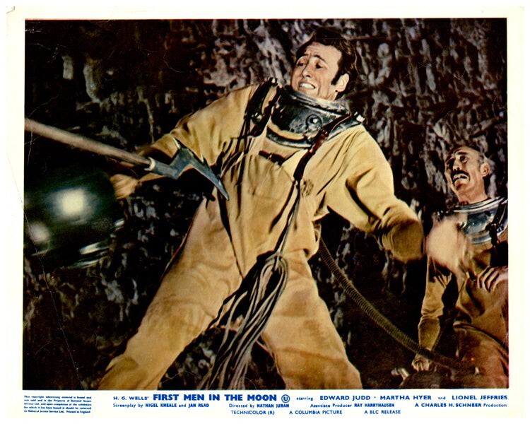 First Men In The Moon Original Lobby Card 1964 Edward Judd Martha Hyer Lionel Jeffries VG Condition Silver Screen Mementos are pleased to be able to offer this authentic original Lobby Card measuring 8x10 inches. This lobby card is from Great Britain and was printed during the actual year the film was released in movie theaters. The lobby card (also known as Front of House/ FOH card in the UK) was created by the film studios to publicize the movie and was intended for display outside the movie theatre in special glass display boxes. These are NOT reproductions! You are looking at a truly original piece of cinema art, a genuine collector's item. We have a huge archive of over 250,000 original lobby cards, mostly from the 1930's to the 1980's. We will be releasing many more rare gems from our vast collection, which will include lobby cards, original photographs, movie stills, magazines, brochures negatives, transparencies, slides and other collectible items of movie memorabilia.