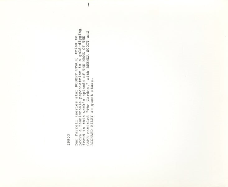 The Name of the Game Robert Stack, Brenda Scott ,Robert Kiley, The Garden Episode Original 8x10 Photo with Snipe 1970 Near Mint Condition This item is an ORIGINAL 8x10 photo from the historic archives of Silver Screen Mementos. This original photograph was made in the actual year the film, television show or event was produced. The movie studios produced publicity photographs for distribution to the press, photo agencies and publicity departments to advertise the film/tv show or event. Very often original photos have press release information on the reverse of the photo - movie credits, description of the scene, event and people involved. This is a historic piece of cinema art and is being offered from one collector to another, no rights given or implied. Silver Screen are gradually releasing thousands of Original Photographs, Transparencies, Negatives, Lobby Cards, Posters, Magazines and other memorabilia from our historic archive.