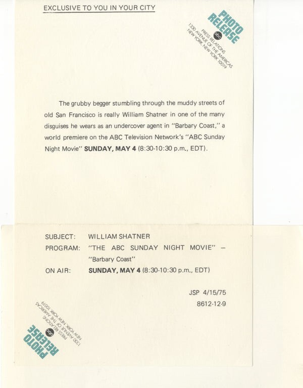 William Shatner Barbary Coast Beggar Disguise Original 7x9 Photo with ABC Snipe 1975 Near Mint Condition This item is an ORIGINAL 8x10 photo from the historic archives of Silver Screen Mementos. This original photograph was made in the actual year the film, television show or event was produced. The movie studios produced publicity photographs for distribution to the press, photo agencies and publicity departments to advertise the film/tv show or event. Very often original photos have press release information on the reverse of the photo - movie credits, description of the scene, event and people involved. This is a historic piece of cinema art and is being offered from one collector to another, no rights given or implied. Silver Screen are gradually releasing thousands of Original Photographs, Transparencies, Negatives, Lobby Cards, Posters, Magazines and other memorabilia from our historic archive.