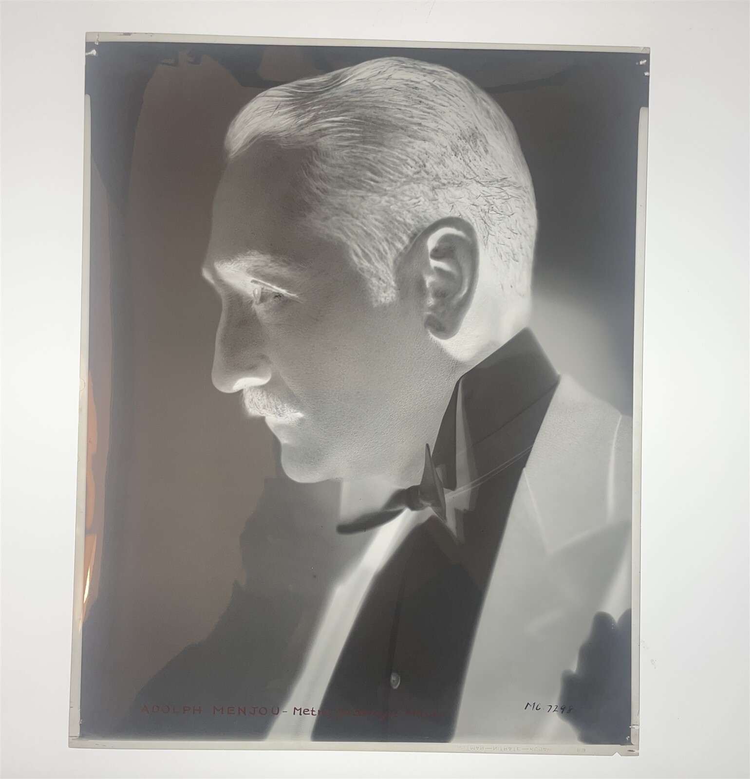 Adolph Menjou 1930's MGM Studio Profile Portrait Original 8x10 Camera Negative with hand-applied India ink code and retouched highlights.This is an original studio or photographer's 8x10 inches black and white photographic negative from our historic archive. This is a real collector's item and would make superb quality photographs or prints. This would also be a great addition to any collection or image archive. This original black and white photographic negative is in Excellent condition. This collector's item is being sold from one collector to another, no rights are given or implied. Silver Screen Mementos are gradually releasing from their vast archives thousands of original photographs, transparencies, negatives, slides, lobby cards and other movie or television memorabilia.