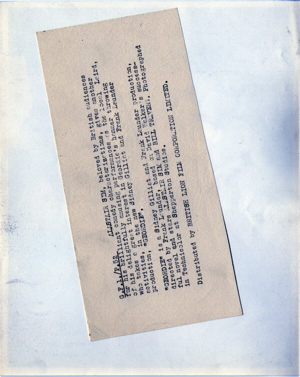 Alastair Sim Wee Geordie 1955 Studio Publicity Portrait Original 8x10 Photo with Snipe VG/Near Mint Condition This item is an ORIGINAL 8x10 photo from the historic archives of Silver Screen Mementos. This original photograph was made in the actual year the film, television show or event was produced. The movie studios produced publicity photographs for distribution to the press, photo agencies and publicity departments to advertise the film/tv show or event. Very often original photos have press release information on the reverse of the photo - movie credits, description of the scene, event and people involved. This is a historic piece of cinema art and is being offered from one collector to another, no rights given or implied. Silver Screen are gradually releasing thousands of Original Photographs, Transparencies, Negatives, Lobby Cards, Posters, Magazines and other memorabilia from our historic archive.
