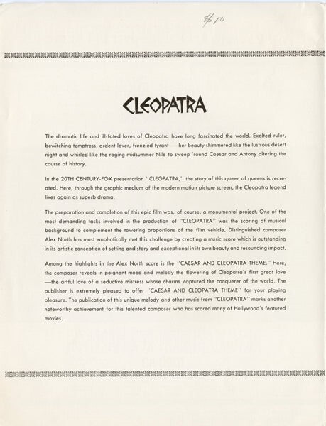 Caesar and Cleopatra theme Piano Solo Original Sheet Music 1963 movie Elizabeth Taylor Rare featuring movie poster art on cover. Measuring approx 9x12 inches in VG/Near Mint Condition. We are gradually releasing from our historic archives original photographs, negatives, transparency, slides, movie posters, magazines, books, press books, pins, autographs, trading cards, press badges and other rare collectors items.