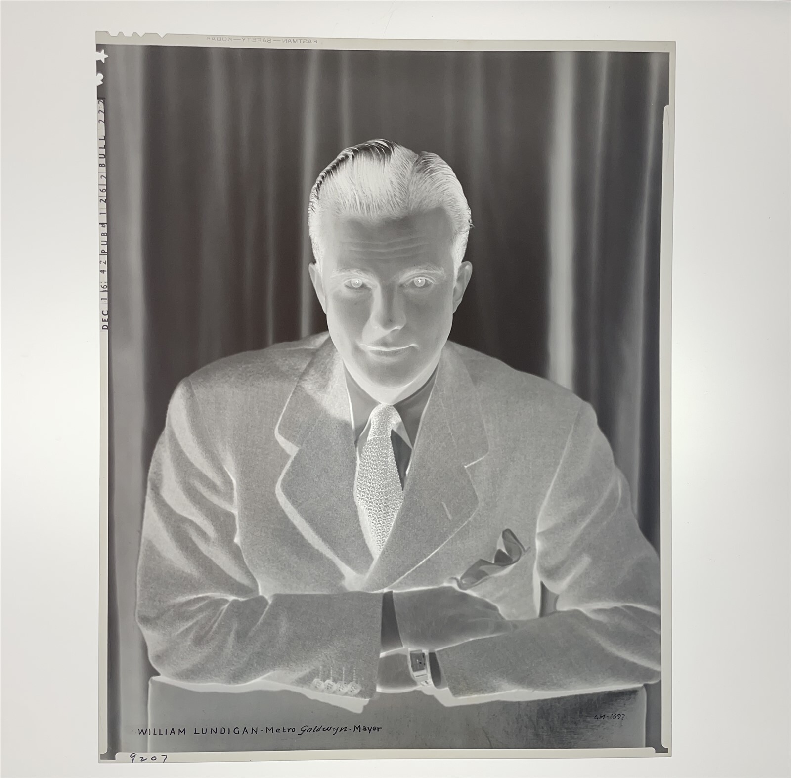 William Lundigan 1940's MGM Studio Portrait Original 8x10 Acetate Camera Negative with hand applied India ink code and retouched highlights by legendary Hollywood photographer Clarence Sinclair Bull.This is an original studio or photographer's 8x10 inches black and white photographic negative from our historic archive. This is a real collector's item and would make superb quality photographs or prints. This would also be a great addition to any collection or image archive. This original black and white photographic negative is in Excellent condition. This collector's item is being sold from one collector to another, no rights are given or implied. Silver Screen Mementos are gradually releasing from their vast archives thousands of original photographs, transparencies, negatives, slides, lobby cards and other movie or television memorabilia.