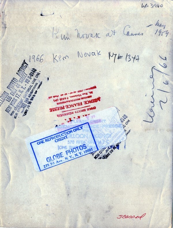 Kim Novak 1959 Cannes Film Festival Nice Airport Original 8x10 Photo Stamped VG Condition This item is an ORIGINAL 8x10 photo from the historic archives of Silver Screen Mementos. This original photograph was made in the actual year the film, television show or event was produced. The movie studios produced publicity photographs for distribution to the press, photo agencies and publicity departments to advertise the film/tv show or event. Very often original photos have press release information on the reverse of the photo - movie credits, description of the scene, event and people involved. This is a historic piece of cinema art and is being offered from one collector to another, no rights given or implied. Silver Screen are gradually releasing thousands of Original Photographs, Transparencies, Negatives, Lobby Cards, Posters, Magazines and other memorabilia from our historic archive.