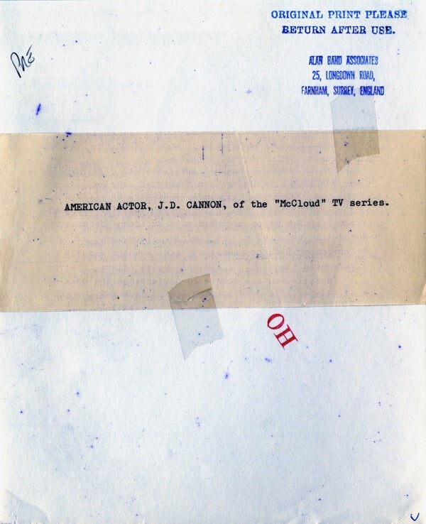 J.D. Cannon McCloud TV Show Original 8x10 approx Photo Stamped VG Condition (border trim) This item is an ORIGINAL 8x10 photo from the historic archives of Silver Screen Mementos. This original photograph was made in the actual year the film, television show or event was produced. The movie studios produced publicity photographs for distribution to the press, photo agencies and publicity departments to advertise the film/tv show or event. Very often original photos have press release information on the reverse of the photo - movie credits, description of the scene, event and people involved. This is a historic piece of cinema art and is being offered from one collector to another, no rights given or implied. Silver Screen are gradually releasing thousands of Original Photographs, Transparencies, Negatives, Lobby Cards, Posters, Magazines and other memorabilia from our historic archive.