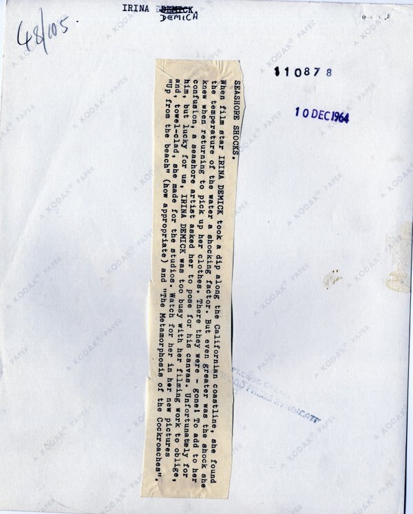 Irina Demick 1964 Original 8x10 Photo Stamped California beach pose by painting VG Condition This item is an ORIGINAL 8x10 photo from the historic archives of Silver Screen Mementos. This original photograph was made in the actual year the film, television show or event was produced. The movie studios produced publicity photographs for distribution to the press, photo agencies and publicity departments to advertise the film/tv show or event. Very often original photos have press release information on the reverse of the photo - movie credits, description of the scene, event and people involved. This is a historic piece of cinema art and is being offered from one collector to another, no rights given or implied. Silver Screen are gradually releasing thousands of Original Photographs, Transparencies, Negatives, Lobby Cards, Posters, Magazines and other memorabilia from our historic archive.