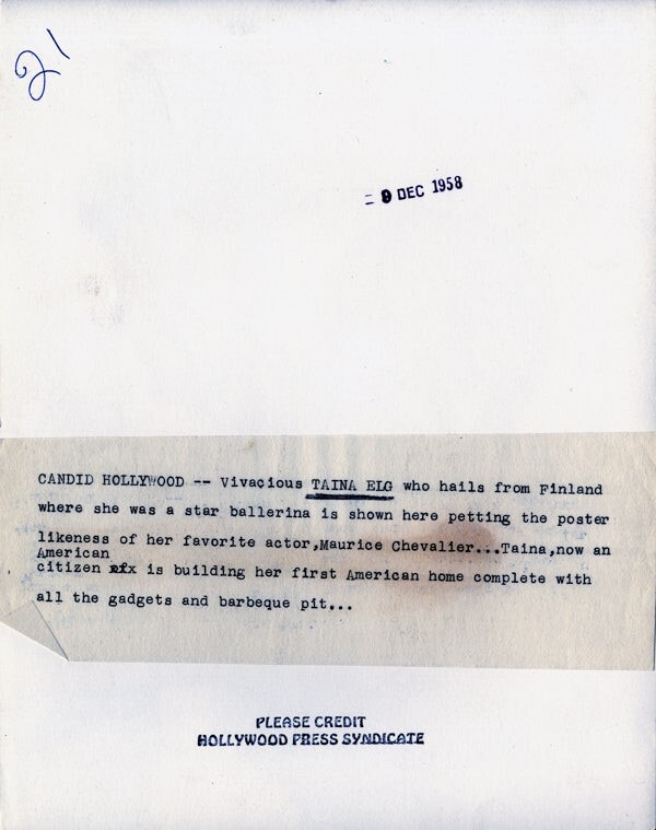 Taina Elg 1958 Original 8x10 Photo posing by Maurice Chevalier poster w snipe VG Condition (border trim) This item is an ORIGINAL 8x10 photo from the historic archives of Silver Screen Mementos. This original photograph was made in the actual year the film, television show or event was produced. The movie studios produced publicity photographs for distribution to the press, photo agencies and publicity departments to advertise the film/tv show or event. Very often original photos have press release information on the reverse of the photo - movie credits, description of the scene, event and people involved. This is a historic piece of cinema art and is being offered from one collector to another, no rights given or implied. Silver Screen are gradually releasing thousands of Original Photographs, Transparencies, Negatives, Lobby Cards, Posters, Magazines and other memorabilia from our historic archive.