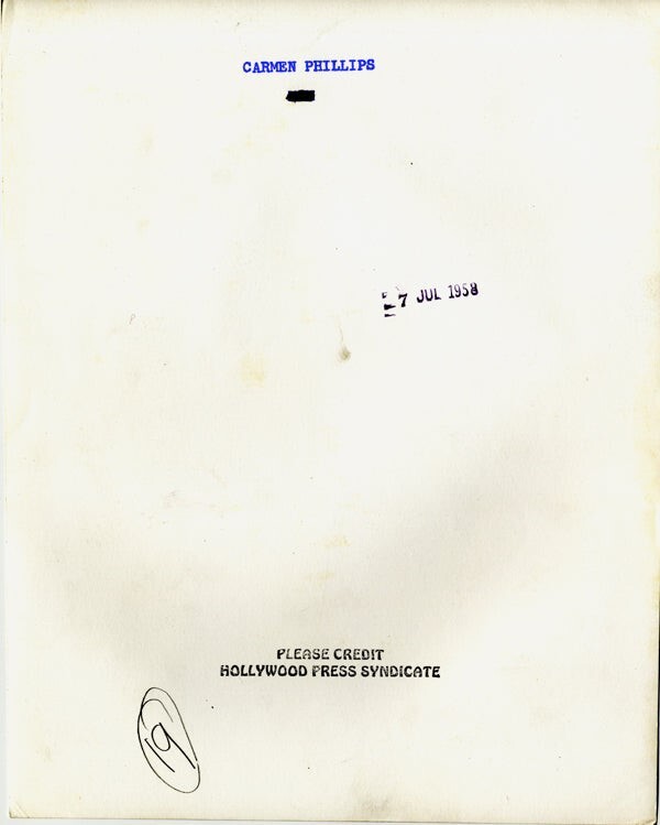 Carmen Phillips 1958 Movie Starlet Glamour Portrait Original 8x10 Photo VG Condition (border trim) This item is an ORIGINAL 8x10 photo from the historic archives of Silver Screen Mementos. This original photograph was made in the actual year the film, television show or event was produced. The movie studios produced publicity photographs for distribution to the press, photo agencies and publicity departments to advertise the film/tv show or event. Very often original photos have press release information on the reverse of the photo - movie credits, description of the scene, event and people involved. This is a historic piece of cinema art and is being offered from one collector to another, no rights given or implied. Silver Screen are gradually releasing thousands of Original Photographs, Transparencies, Negatives, Lobby Cards, Posters, Magazines and other memorabilia from our historic archive.