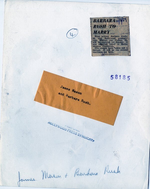 James Mason Barbara Rush romantic portrait Original 8x10 Photo With Snipe VG Condition (border trim) This item is an ORIGINAL 8x10 photo from the historic archives of Silver Screen Mementos. This original photograph was made in the actual year the film, television show or event was produced. The movie studios produced publicity photographs for distribution to the press, photo agencies and publicity departments to advertise the film/tv show or event. Very often original photos have press release information on the reverse of the photo - movie credits, description of the scene, event and people involved. This is a historic piece of cinema art and is being offered from one collector to another, no rights given or implied. Silver Screen are gradually releasing thousands of Original Photographs, Transparencies, Negatives, Lobby Cards, Posters, Magazines and other memorabilia from our historic archive.