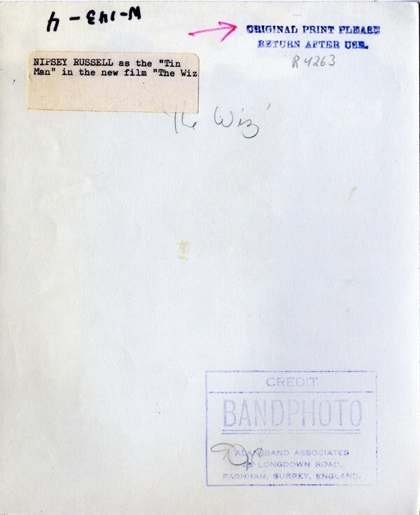 Nipsey Russell as Tin Man The Wiz Original 8x10 approx Photo Stamped candid on set rare VG/Near Mint Condition This item is an ORIGINAL 8x10 photo from the historic archives of Silver Screen Mementos. This original photograph was made in the actual year the film, television show or event was produced. The movie studios produced publicity photographs for distribution to the press, photo agencies and publicity departments to advertise the film/tv show or event. Very often original photos have press release information on the reverse of the photo - movie credits, description of the scene, event and people involved. This is a historic piece of cinema art and is being offered from one collector to another, no rights given or implied. Silver Screen are gradually releasing thousands of Original Photographs, Transparencies, Negatives, Lobby Cards, Posters, Magazines and other memorabilia from our historic archive.