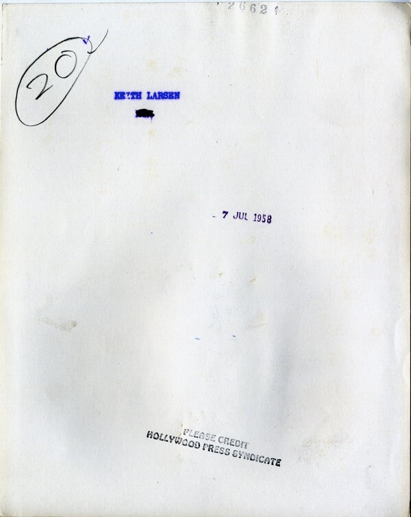 Keith Larsen 1958 Original 8x10 Photo Northwest Passage star VG Condition (border trim) This item is an ORIGINAL 8x10 photo from the historic archives of Silver Screen Mementos. This original photograph was made in the actual year the film, television show or event was produced. The movie studios produced publicity photographs for distribution to the press, photo agencies and publicity departments to advertise the film/tv show or event. Very often original photos have press release information on the reverse of the photo - movie credits, description of the scene, event and people involved. This is a historic piece of cinema art and is being offered from one collector to another, no rights given or implied. Silver Screen are gradually releasing thousands of Original Photographs, Transparencies, Negatives, Lobby Cards, Posters, Magazines and other memorabilia from our historic archive.