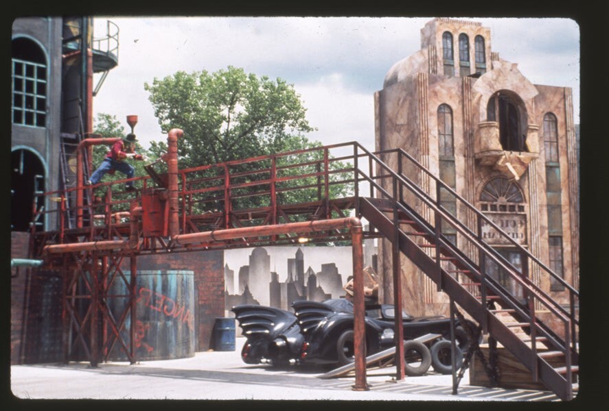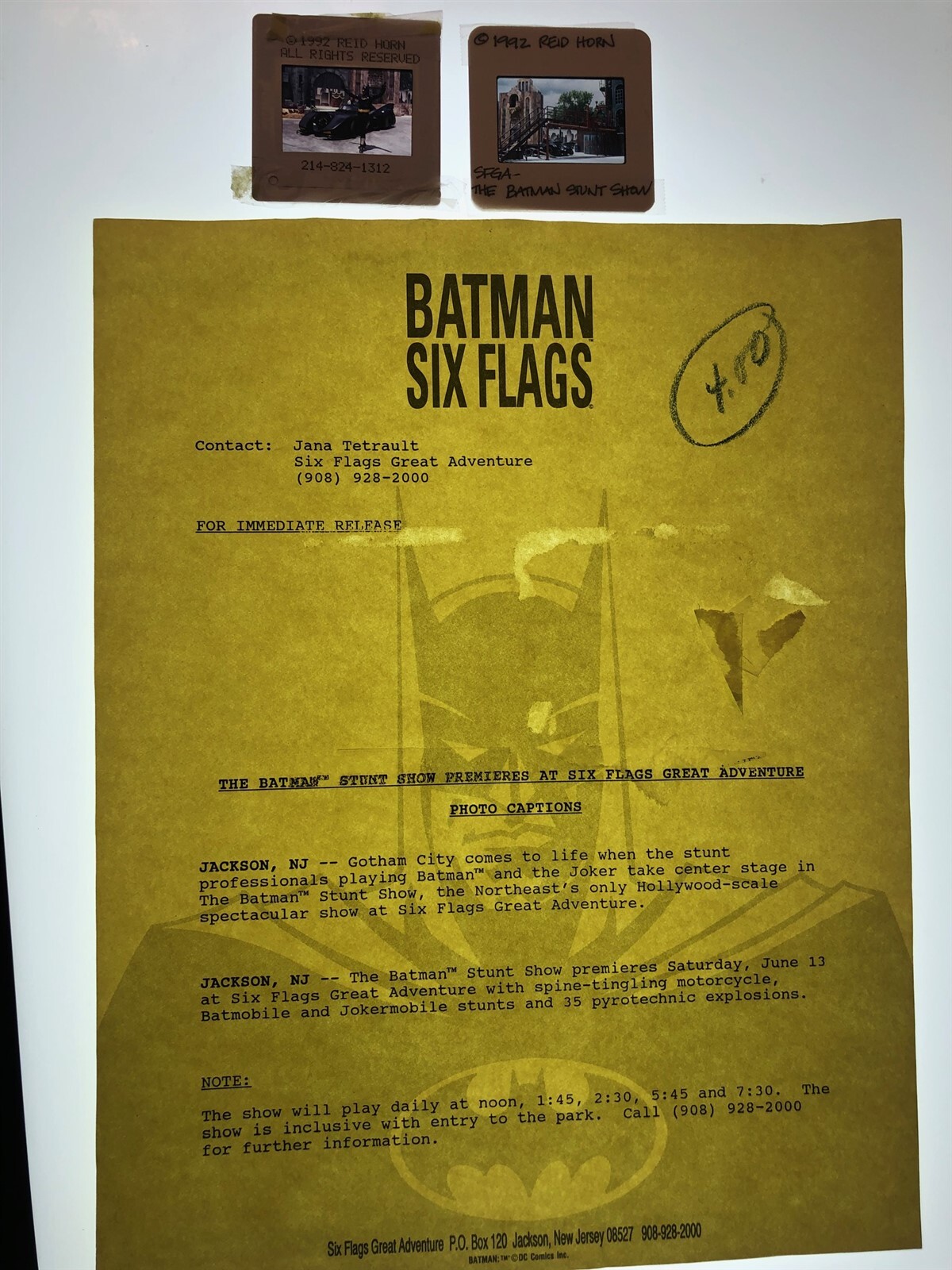 Batman Batmobile Stunt Show Six Flags 2 Original 35mm Transparency Press Sheet - A press release and two original 35mm transparency slides for the Batman attraction at Six Flags Great Adventure Theme ParkThis is an original studio or photographer's 35 mm color slide transparency from our historic archive. This is a real collector's item and would make superb quality photographs or prints. This would also be a great addition to any collection or image archive. This original color slide transparency is in Excellent condition. This collector's item is being sold from one collector to another, no rights are given or implied. Silver Screen Mementos are gradually releasing from their vast archives thousands of original photographs, transparencies, negatives, slides, lobby cards and other movie or television memorabilia.