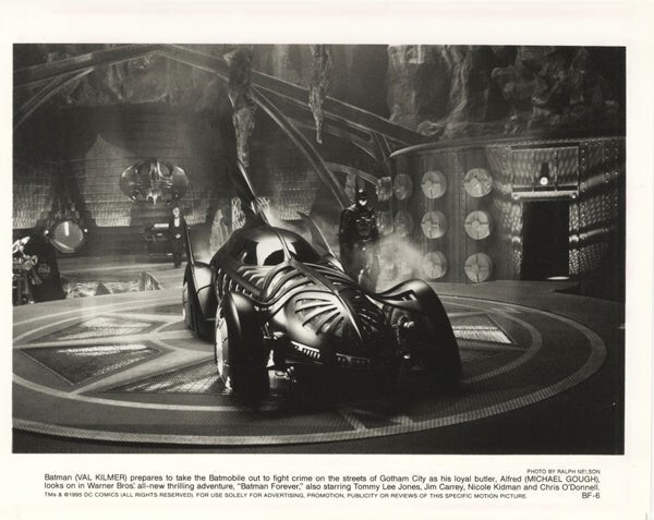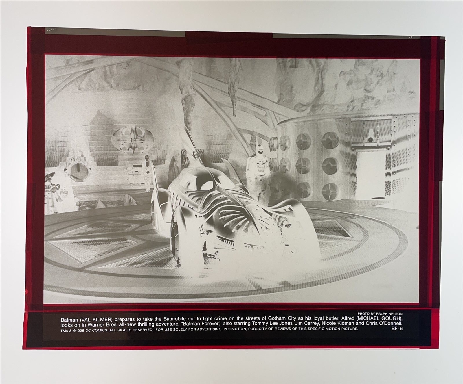 Batman Forever 1995 Val Kilmer Batmobile Bat Cave Original 8x10 Negative & Photo - A very rare Original 8x10 studio negative with credit caption and an 8x10 original photograph. This is an original studio or photographer's 8x10 inches black and white photographic negative from our historic archive. This is a real collector's item and would make superb quality photographs or prints. This would also be a great addition to any collection or image archive. This original black and white photographic negative is in Excellent condition. This collector's item is being sold from one collector to another, no rights are given or implied. Silver Screen Mementos are gradually releasing from their vast archives thousands of original photographs, transparencies, negatives, slides, lobby cards and other movie or television memorabilia.