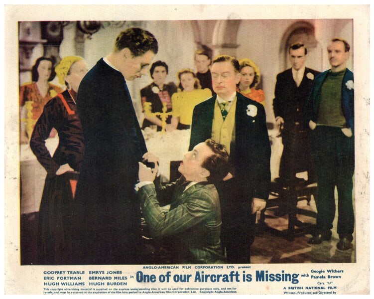 One Of Our Aircraft Is Missing Original Lobby Card 1942 Godfrey Tearle Eric Portman Hugh Williams Bernard Miles in Michael Powell's World War 2 classic VG Condition Silver Screen Mementos are pleased to be able to offer this authentic original Lobby Card measuring 8x10 inches. This lobby card is from Great Britain and was printed during the actual year the film was released in movie theaters. The lobby card (also known as Front of House/ FOH card in the UK) was created by the film studios to publicize the movie and was intended for display outside the movie theatre in special glass display boxes. These are NOT reproductions! You are looking at a truly original piece of cinema art, a genuine collector's item. We have a huge archive of over 250,000 original lobby cards, mostly from the 1930's to the 1980's. We will be releasing many more rare gems from our vast collection, which will include lobby cards, original photographs, movie stills, magazines, brochures negatives, transparencies, slides and other collectible items of movie memorabilia.