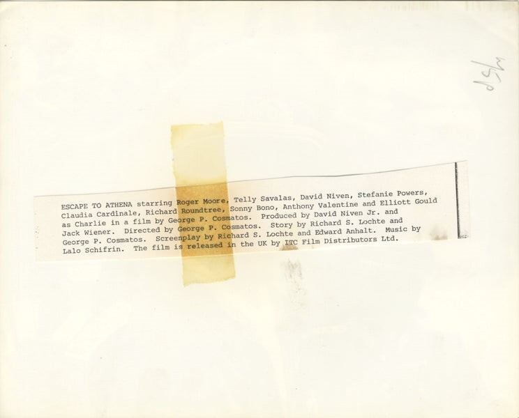 Roger Moore Escape to Athena 1979 in German Officer uniform WW 2 Original 8x10 Photo with Snipe VG/Near Mint Condition This item is an ORIGINAL 8x10 photo from the historic archives of Silver Screen Mementos. This original photograph was made in the actual year the film, television show or event was produced. The movie studios produced publicity photographs for distribution to the press, photo agencies and publicity departments to advertise the film/tv show or event. Very often original photos have press release information on the reverse of the photo - movie credits, description of the scene, event and people involved. This is a historic piece of cinema art and is being offered from one collector to another, no rights given or implied. Silver Screen are gradually releasing thousands of Original Photographs, Transparencies, Negatives, Lobby Cards, Posters, Magazines and other memorabilia from our historic archive.