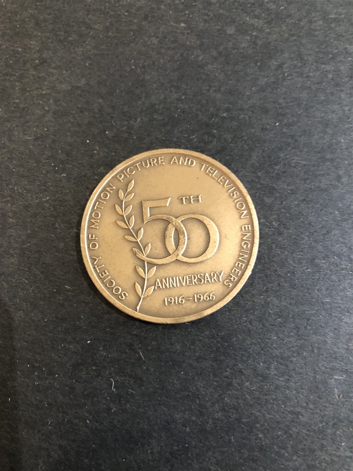 SMPTE 50th Anniversary Bronze Medal 1966 Commemorative Coin Motion Picture & TV Engineers rare 39mm Bronze in Near Mint Condition We are gradually releasing from our historic archives original photographs, negatives, transparency, slides, movie posters, magazines, books, press books, pins, autographs, trading cards, press badges and other rare collectors items.