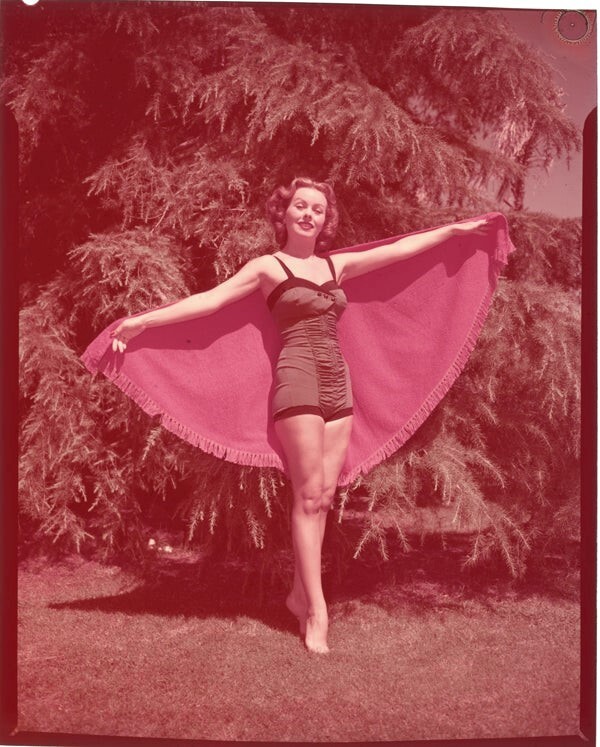 Jeanne Crain 1940's Cole of California Leggy Barefoot Swimsuit Photo Shoot Original 4x5 Transparency with Snipe, A gorgeous rare glamour portrait of the classic star being released from our historic archivesThis is an original studio or photographer's 4x5 inches color slide transparency from our historic archive. This is a real collector's item and would make superb quality photographs or prints. This would also be a great addition to any collection or image archive. This original color slide transparency is in Excellent condition. This collector's item is being sold from one collector to another, no rights are given or implied. Silver Screen Mementos are gradually releasing from their vast archives thousands of original photographs, transparencies, negatives, slides, lobby cards and other movie or television memorabilia.
