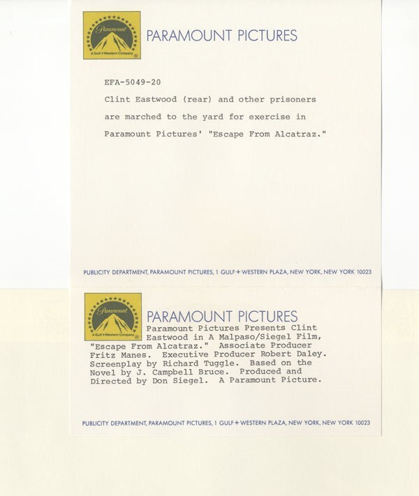 Escape From Alcatraz 1979 Clint Eastwood, Larry Hankin Prison Yard Scene Original 8x10 Photo with paper caption Snipe near Mint Condition This item is an ORIGINAL 8x10 photo from the historic archives of Silver Screen Mementos. This original photograph was made in the actual year the film, television show or event was produced. The movie studios produced publicity photographs for distribution to the press, photo agencies and publicity departments to advertise the film/tv show or event. Very often original photos have press release information on the reverse of the photo - movie credits, description of the scene, event and people involved. This is a historic piece of cinema art and is being offered from one collector to another, no rights given or implied. Silver Screen are gradually releasing thousands of Original Photographs, Transparencies, Negatives, Lobby Cards, Posters, Magazines and other memorabilia from our historic archive.