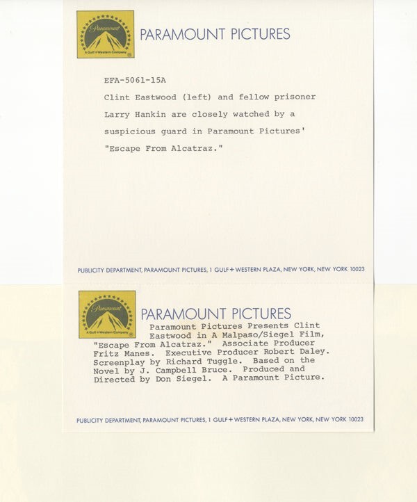 Escape From Alcatraz 1979 Clint Eastwood, Jack Thibeau Original 8x10 Photo with paper caption Snipe Near Mint Condition This item is an ORIGINAL 8x10 photo from the historic archives of Silver Screen Mementos. This original photograph was made in the actual year the film, television show or event was produced. The movie studios produced publicity photographs for distribution to the press, photo agencies and publicity departments to advertise the film/tv show or event. Very often original photos have press release information on the reverse of the photo - movie credits, description of the scene, event and people involved. This is a historic piece of cinema art and is being offered from one collector to another, no rights given or implied. Silver Screen are gradually releasing thousands of Original Photographs, Transparencies, Negatives, Lobby Cards, Posters, Magazines and other memorabilia from our historic archive.