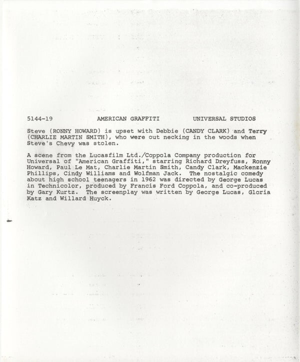 American Graffiti 1973 Ron Howard, Candy Clark, Charlie Martin Smith Original 8x10 Photo with Snipe Near Mint Condition This item is an ORIGINAL 8x10 photo from the historic archives of Silver Screen Mementos. This original photograph was made in the actual year the film, television show or event was produced. The movie studios produced publicity photographs for distribution to the press, photo agencies and publicity departments to advertise the film/tv show or event. Very often original photos have press release information on the reverse of the photo - movie credits, description of the scene, event and people involved. This is a historic piece of cinema art and is being offered from one collector to another, no rights given or implied. Silver Screen are gradually releasing thousands of Original Photographs, Transparencies, Negatives, Lobby Cards, Posters, Magazines and other memorabilia from our historic archive.
