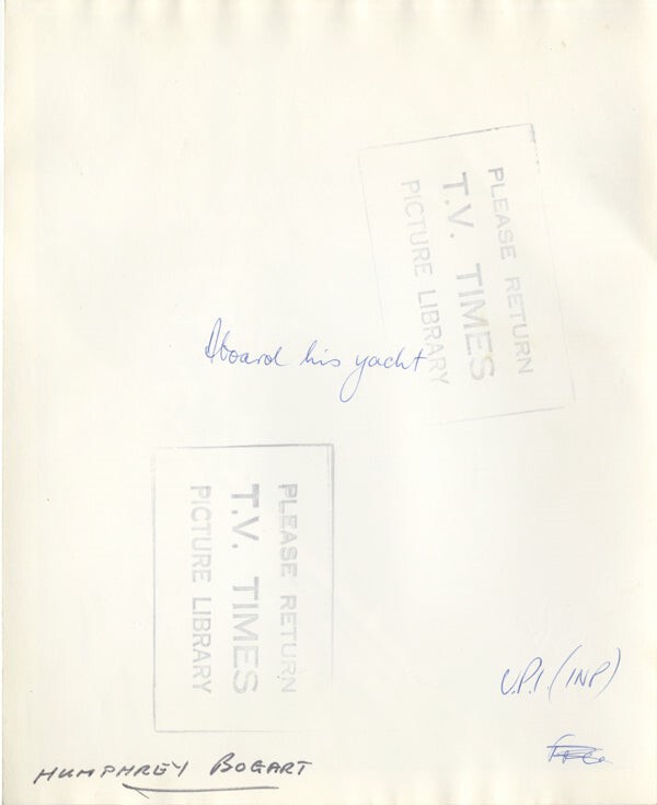 Humphrey Bogart 1950's sailing aboard his yacht Santana Original 8x10 Photo Stamped, very rare in VG Condition This item is an ORIGINAL 8x10 photo from the historic archives of Silver Screen Mementos. This original photograph was made in the actual year the film, television show or event was produced. The movie studios produced publicity photographs for distribution to the press, photo agencies and publicity departments to advertise the film/tv show or event. Very often original photos have press release information on the reverse of the photo - movie credits, description of the scene, event and people involved. This is a historic piece of cinema art and is being offered from one collector to another, no rights given or implied. Silver Screen are gradually releasing thousands of Original Photographs, Transparencies, Negatives, Lobby Cards, Posters, Magazines and other memorabilia from our historic archive.