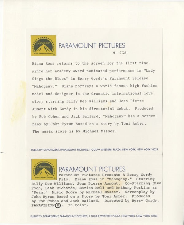 Diana Ross Mahogany 1975 Lace Camisole Lingerie Glamour Original 8x10 Photo Snipe Near Mint Condition This item is an ORIGINAL 8x10 photo from the historic archives of Silver Screen Mementos. This original photograph was made in the actual year the film, television show or event was produced. The movie studios produced publicity photographs for distribution to the press, photo agencies and publicity departments to advertise the film/tv show or event. Very often original photos have press release information on the reverse of the photo - movie credits, description of the scene, event and people involved. This is a historic piece of cinema art and is being offered from one collector to another, no rights given or implied. Silver Screen are gradually releasing thousands of Original Photographs, Transparencies, Negatives, Lobby Cards, Posters, Magazines and other memorabilia from our historic archive.