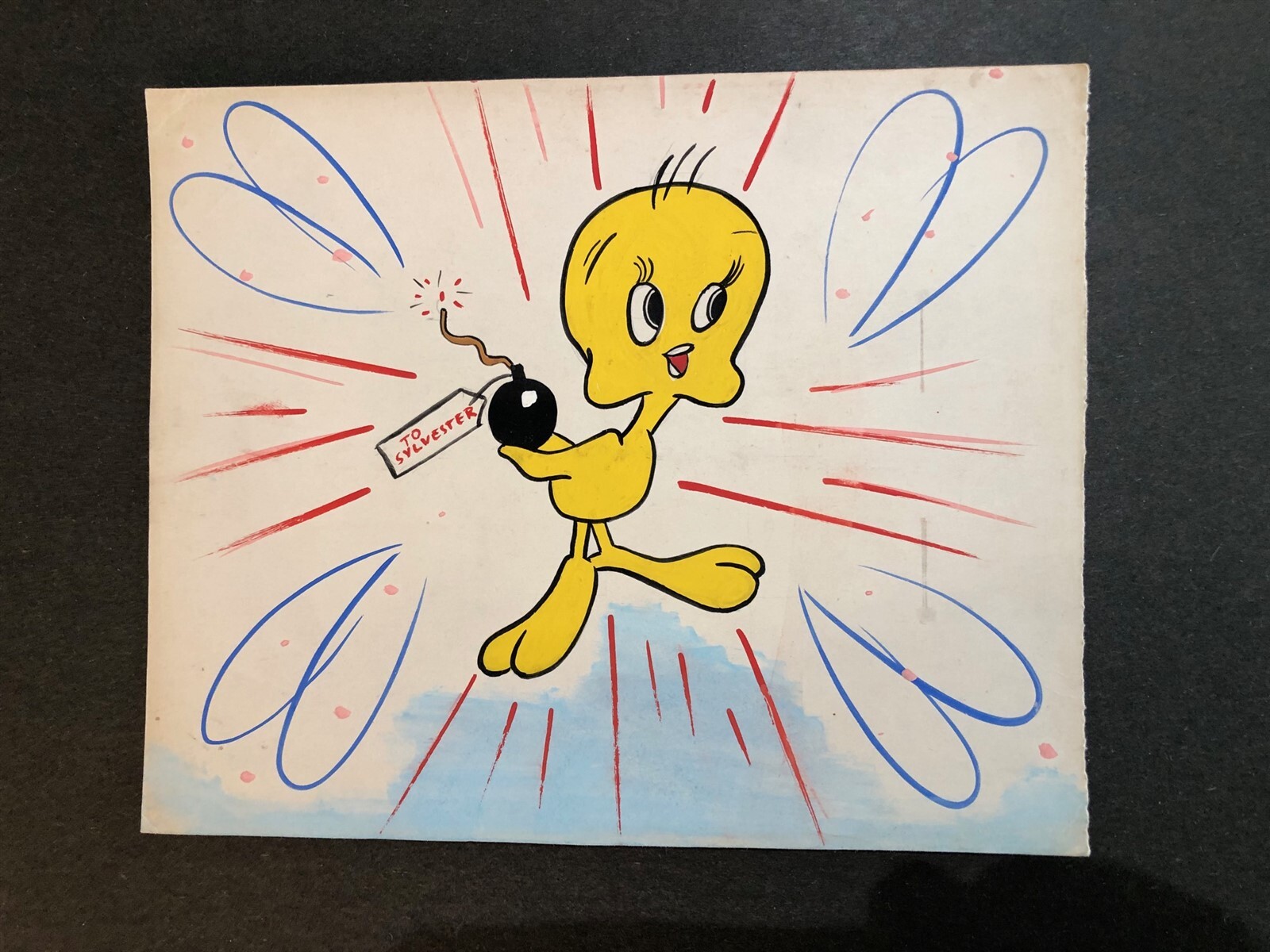 Looney Tunes Merrie Melodies Tweetie Tweety Pie Bird 1947 Original Hand Painted Movie Artwork - Extremely rare original hand painted artwork for the Merrie Melodies Looney Tunes Cartoon 'Tweetie Pie' released in 1947. This is a one of a kind original character art produced by Warner Bros for the release of the 1947 cartoon movie in the UK and measures 8x10 inches. This is the original hand painted artwork from which 8x10 inch Lobby Card was to be produced to fit into glass boxes that were displayed outside UK movie theatres (cinemas), also known as 'Front of House'. This unique collectors item measures 8x10 inches and is in VG/Near Mint Condition We are gradually releasing from our historic archives original photographs, negatives, transparency, slides, movie posters, magazines, books, press books, pins, autographs, trading cards, press badges and other rare collectors items.