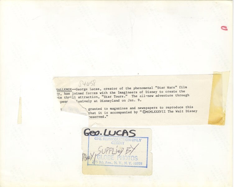 Star Wars Director George Lucas creating Disneyland Star Tours Star Wars Attraction on site Original 8x10 Photo Stamped with Snipe 1987 VG/Near Mint Condition This item is an ORIGINAL 8x10 photo from the historic archives of Silver Screen Mementos. This original photograph was made in the actual year the film, television show or event was produced. The movie studios produced publicity photographs for distribution to the press, photo agencies and publicity departments to advertise the film/tv show or event. Very often original photos have press release information on the reverse of the photo - movie credits, description of the scene, event and people involved. This is a historic piece of cinema art and is being offered from one collector to another, no rights given or implied. Silver Screen are gradually releasing thousands of Original Photographs, Transparencies, Negatives, Lobby Cards, Posters, Magazines and other memorabilia from our historic archive.