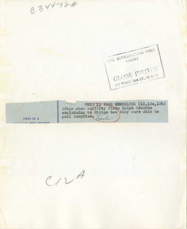 Dean Martin, Jerry Lewis, Milton Berle, Phil Silvers, backstage with Ralph Edwards 1956 This is Your Life Show Original 8x10 Photo Stamped with Snipe Good/VG Condition (creases at corners, wear to edges) This item is an ORIGINAL 8x10 photo from the historic archives of Silver Screen Mementos. This original photograph was made in the actual year the film, television show or event was produced. The movie studios produced publicity photographs for distribution to the press, photo agencies and publicity departments to advertise the film/tv show or event. Very often original photos have press release information on the reverse of the photo - movie credits, description of the scene, event and people involved. This is a historic piece of cinema art and is being offered from one collector to another, no rights given or implied. Silver Screen are gradually releasing thousands of Original Photographs, Transparencies, Negatives, Lobby Cards, Posters, Magazines and other memorabilia from our historic archive.