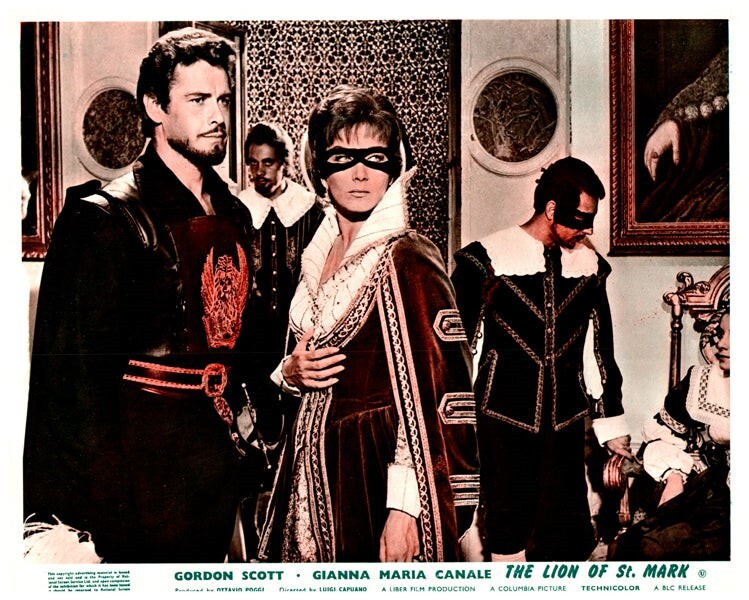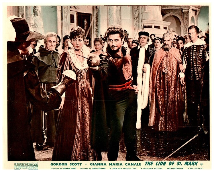 The Lion Of St Mark Original Lobby Card 1963 Gordon Scott Gianna Maria Canale Rik Battaglia Alberto Farnese VG Condition Silver Screen Mementos are pleased to be able to offer this authentic original Lobby Card measuring 8x10 inches. This lobby card is from Great Britain and was printed during the actual year the film was released in movie theaters. The lobby card (also known as Front of House/ FOH card in the UK) was created by the film studios to publicize the movie and was intended for display outside the movie theatre in special glass display boxes. These are NOT reproductions! You are looking at a truly original piece of cinema art, a genuine collector's item. We have a huge archive of over 250,000 original lobby cards, mostly from the 1930's to the 1980's. We will be releasing many more rare gems from our vast collection, which will include lobby cards, original photographs, movie stills, magazines, brochures negatives, transparencies, slides and other collectible items of movie memorabilia.