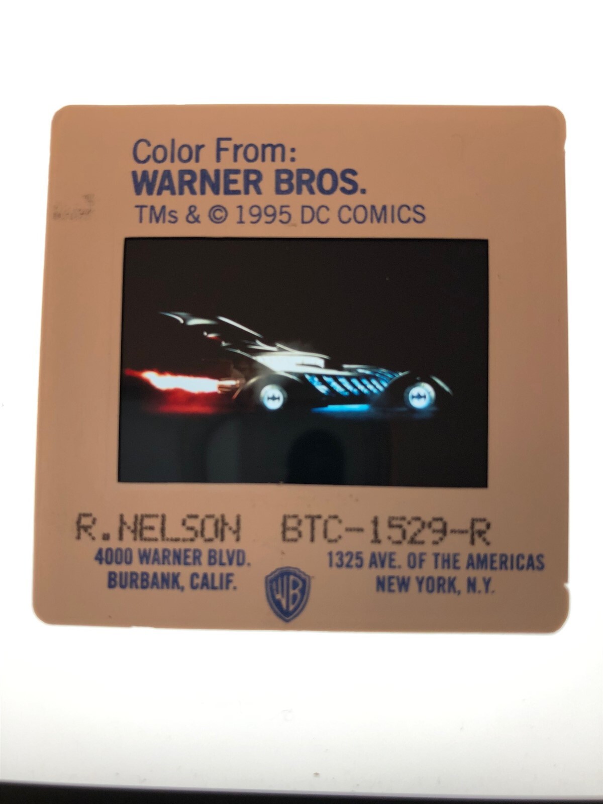 Batman Forever Batmobile Model Tim Flattery Design Original 35mm Transparency Stamped Mount 1995This is an original studio or photographer's 35 mm color slide transparency from our historic archive. This is a real collector's item and would make superb quality photographs or prints. This would also be a great addition to any collection or image archive. This original color slide transparency is in Excellent condition. This collector's item is being sold from one collector to another, no rights are given or implied. Silver Screen Mementos are gradually releasing from their vast archives thousands of original photographs, transparencies, negatives, slides, lobby cards and other movie or television memorabilia.