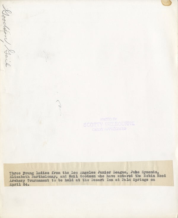 1930's Sexy Leggy Women June Symonds, Elizabeth Bartholomay, Gail Goodson, Robin Hood Archery Tournament Palm Springs Original 8x10 Photo Stamped with Snipe VG Condition This is an original photograph from our historic archives. We have a huge archive of original photographs, negatives, transparencies, posters, magazines and rare memorabilia that we are gradually releasing.