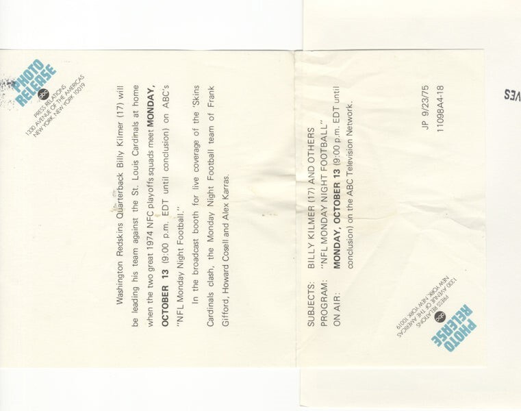 Billy Kilmer Quarterback Washington Redskins NFL Football on field mid game Original 7x9 Photo with ABC Snipe 1975 VG Condition This is an original photograph from our historic archives. We have a huge archive of original photographs, negatives, transparencies, posters, magazines and rare memorabilia that we are gradually releasing.