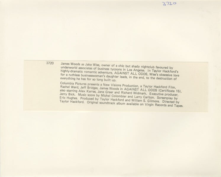 James Woods Against All Odds 1984 smoking cigarette Original 8x10 Photo with Snipe Near Mint Condition This item is an ORIGINAL 8x10 photo from the historic archives of Silver Screen Mementos. This original photograph was made in the actual year the film, television show or event was produced. The movie studios produced publicity photographs for distribution to the press, photo agencies and publicity departments to advertise the film/tv show or event. Very often original photos have press release information on the reverse of the photo - movie credits, description of the scene, event and people involved. This is a historic piece of cinema art and is being offered from one collector to another, no rights given or implied. Silver Screen are gradually releasing thousands of Original Photographs, Transparencies, Negatives, Lobby Cards, Posters, Magazines and other memorabilia from our historic archive.
