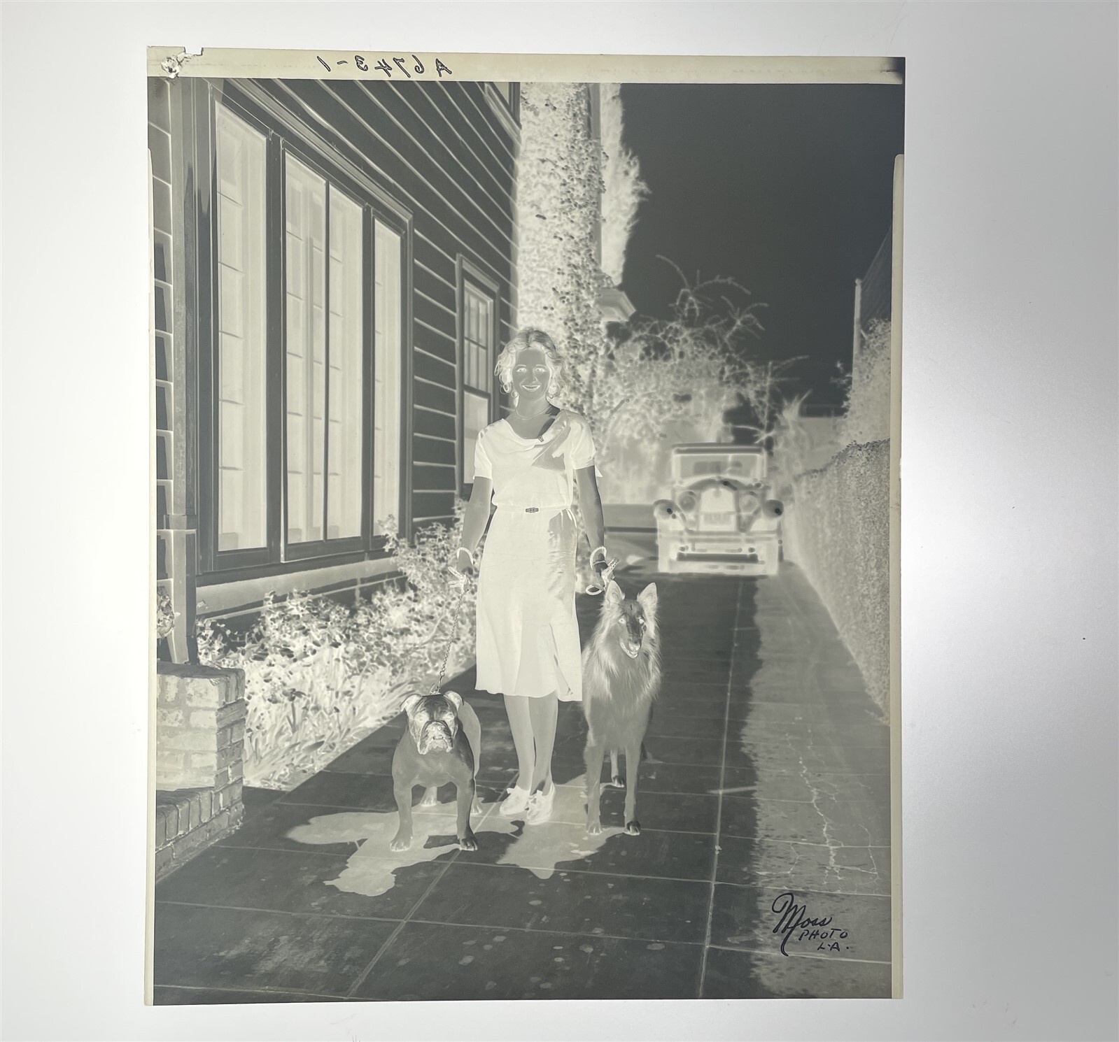 1930's Movie Starlet Moss Photo LA Vintage Car dogs Original 8x10 Camera Negative with hand applied India Ink CodeThis is an original studio or photographer's 8x10 inches black and white photographic negative from our historic archive. This is a real collector's item and would make superb quality photographs or prints. This would also be a great addition to any collection or image archive. This original black and white photographic negative is in Excellent condition. This collector's item is being sold from one collector to another, no rights are given or implied. Silver Screen Mementos are gradually releasing from their vast archives thousands of original photographs, transparencies, negatives, slides, lobby cards and other movie or television memorabilia.