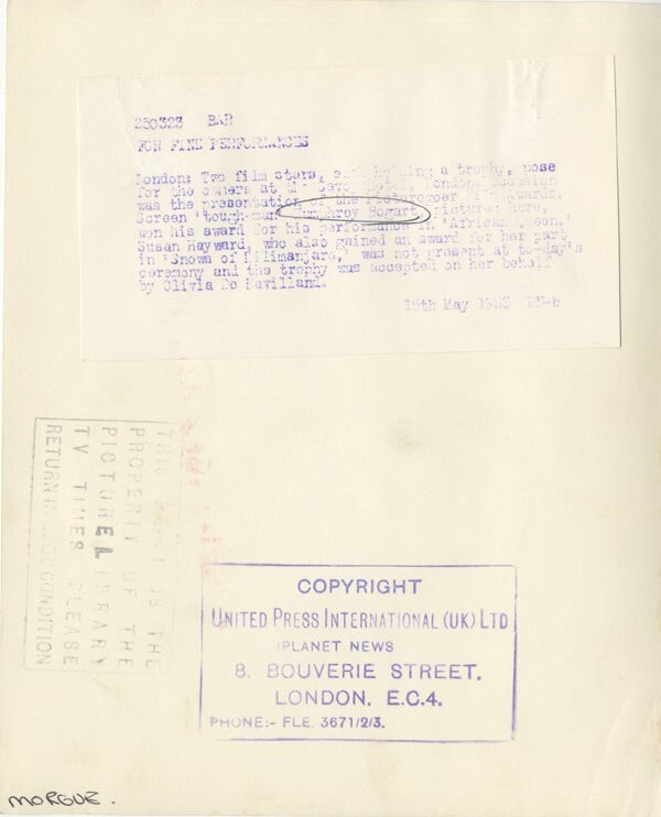 Humphrey Bogart & Olivia De Havilland 1955 Original Stamped 8x10 Photo with paper caption snipe - very rare both stars holding 'Picturegoer' magazine awards - VG/Near Mint Condition This item is an ORIGINAL 8x10 photo from the historic archives of Silver Screen Mementos. This original photograph was made in the actual year the film, television show or event was produced. The movie studios produced publicity photographs for distribution to the press, photo agencies and publicity departments to advertise the film/tv show or event. Very often original photos have press release information on the reverse of the photo - movie credits, description of the scene, event and people involved. This is a historic piece of cinema art and is being offered from one collector to another, no rights given or implied. Silver Screen are gradually releasing thousands of Original Photographs, Transparencies, Negatives, Lobby Cards, Posters, Magazines and other memorabilia from our historic archive.