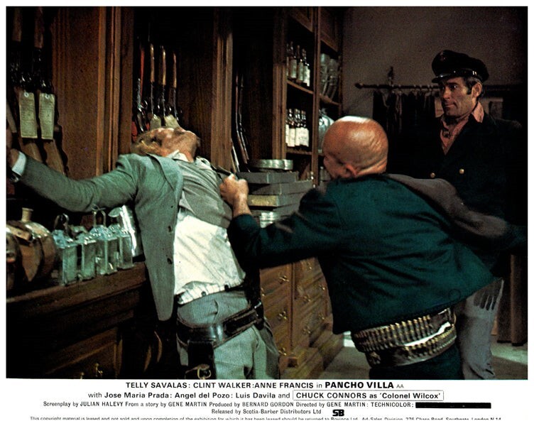 Pancho Villa Original Lobby Card 1972 Telly Savalas Clint Walker Chuck Connors Anne Francis VG Condition Silver Screen Mementos are pleased to be able to offer this authentic original Lobby Card measuring 8x10 inches. This lobby card is from Great Britain and was printed during the actual year the film was released in movie theaters. The lobby card (also known as Front of House/ FOH card in the UK) was created by the film studios to publicize the movie and was intended for display outside the movie theatre in special glass display boxes. These are NOT reproductions! You are looking at a truly original piece of cinema art, a genuine collector's item. We have a huge archive of over 250,000 original lobby cards, mostly from the 1930's to the 1980's. We will be releasing many more rare gems from our vast collection, which will include lobby cards, original photographs, movie stills, magazines, brochures negatives, transparencies, slides and other collectible items of movie memorabilia.