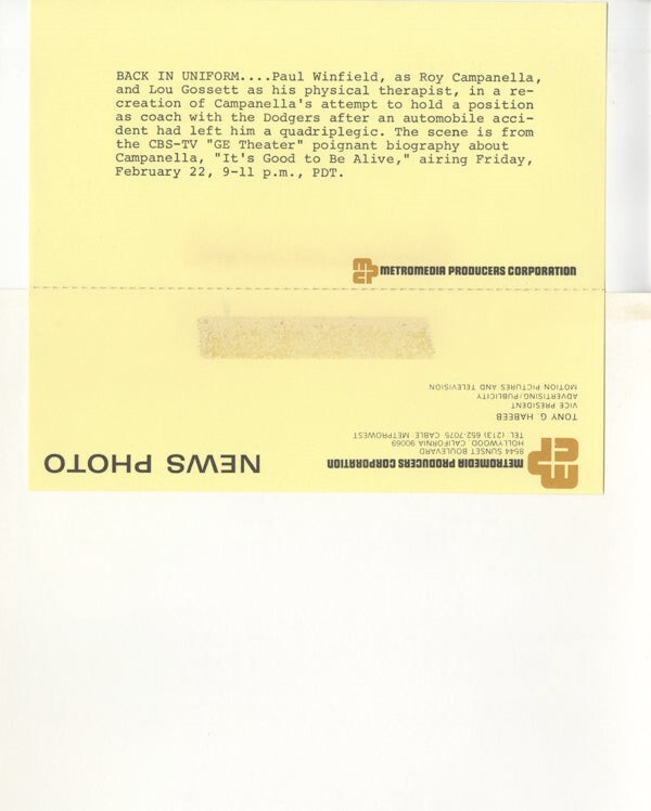 It's Good To Be Alive Paul Winfield Louis Gossett Jr. Original 8x10 Photo Roy Campanella story with paper caption snipe - Near Mint Condition This item is an ORIGINAL 8x10 photo from the historic archives of Silver Screen Mementos. This original photograph was made in the actual year the film, television show or event was produced. The movie studios produced publicity photographs for distribution to the press, photo agencies and publicity departments to advertise the film/tv show or event. Very often original photos have press release information on the reverse of the photo - movie credits, description of the scene, event and people involved. This is a historic piece of cinema art and is being offered from one collector to another, no rights given or implied. Silver Screen are gradually releasing thousands of Original Photographs, Transparencies, Negatives, Lobby Cards, Posters, Magazines and other memorabilia from our historic archive.