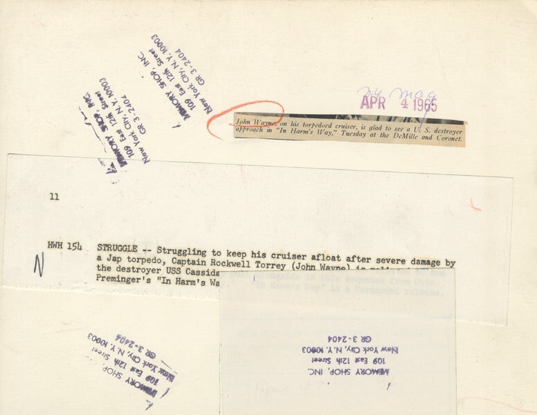 John Wayne on bullhorn Battleship In Harm's Way Original Double Weight Silver Gelatin Stamped 7x9 approx Photo with snipe VG/Near Mint This item is an ORIGINAL 8x10 photo from the historic archives of Silver Screen Mementos. This original photograph was made in the actual year the film, television show or event was produced. The movie studios produced publicity photographs for distribution to the press, photo agencies and publicity departments to advertise the film/tv show or event. Very often original photos have press release information on the reverse of the photo - movie credits, description of the scene, event and people involved. This is a historic piece of cinema art and is being offered from one collector to another, no rights given or implied. Silver Screen are gradually releasing thousands of Original Photographs, Transparencies, Negatives, Lobby Cards, Posters, Magazines and other memorabilia from our historic archive.