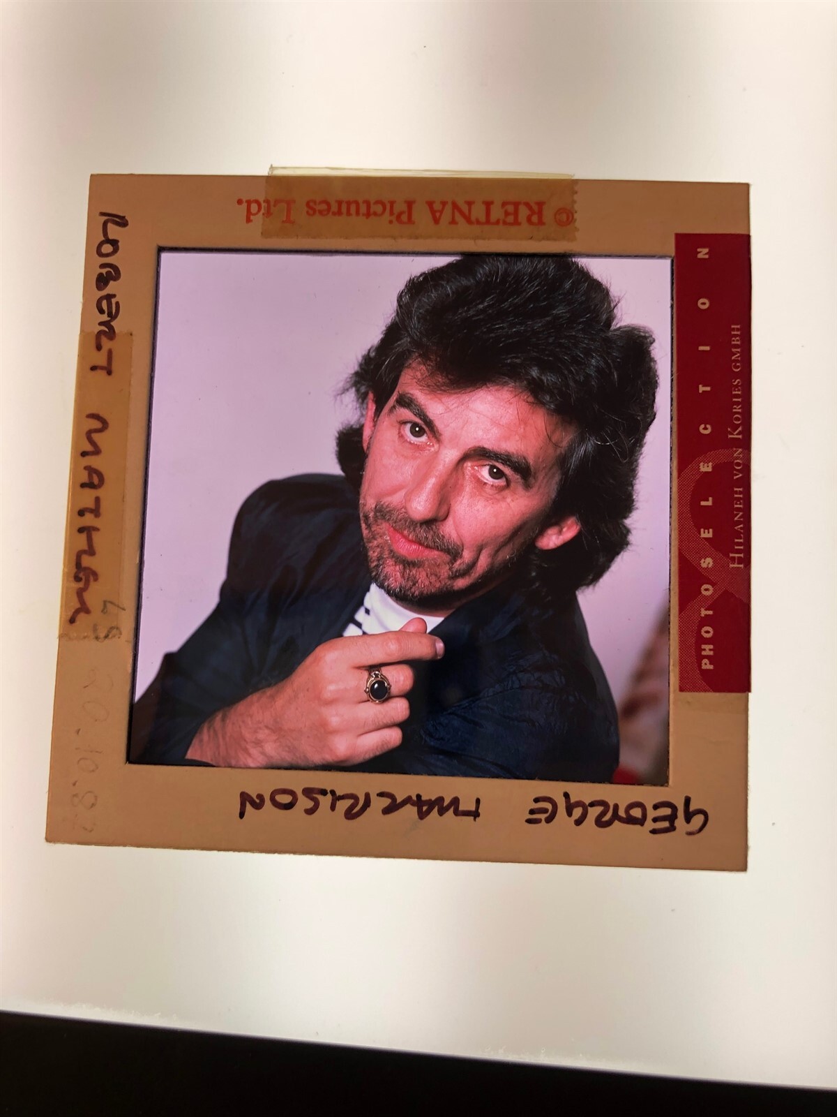 George Harrison Beatles Icon 1990's Photo Shoot Original 2.25 x 2.25 Transparency This is an original studio or photographer's 2.25 x 2.25 inches color slide transparency from our historic archive. This is a real collector's item and would make superb quality photographs or prints. This would also be a great addition to any collection or image archive. This original color slide transparency is in Excellent condition. This collector's item is being sold from one collector to another, no rights are given or implied. Silver Screen Mementos are gradually releasing from their vast archives thousands of original photographs, transparencies, negatives, slides, lobby cards and other movie or television memorabilia.